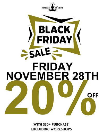 Aura's World Black Friday Sale! Show your love with 15% off when you spend $30 or more (excluding workshops). Join us this Friday November 29th!